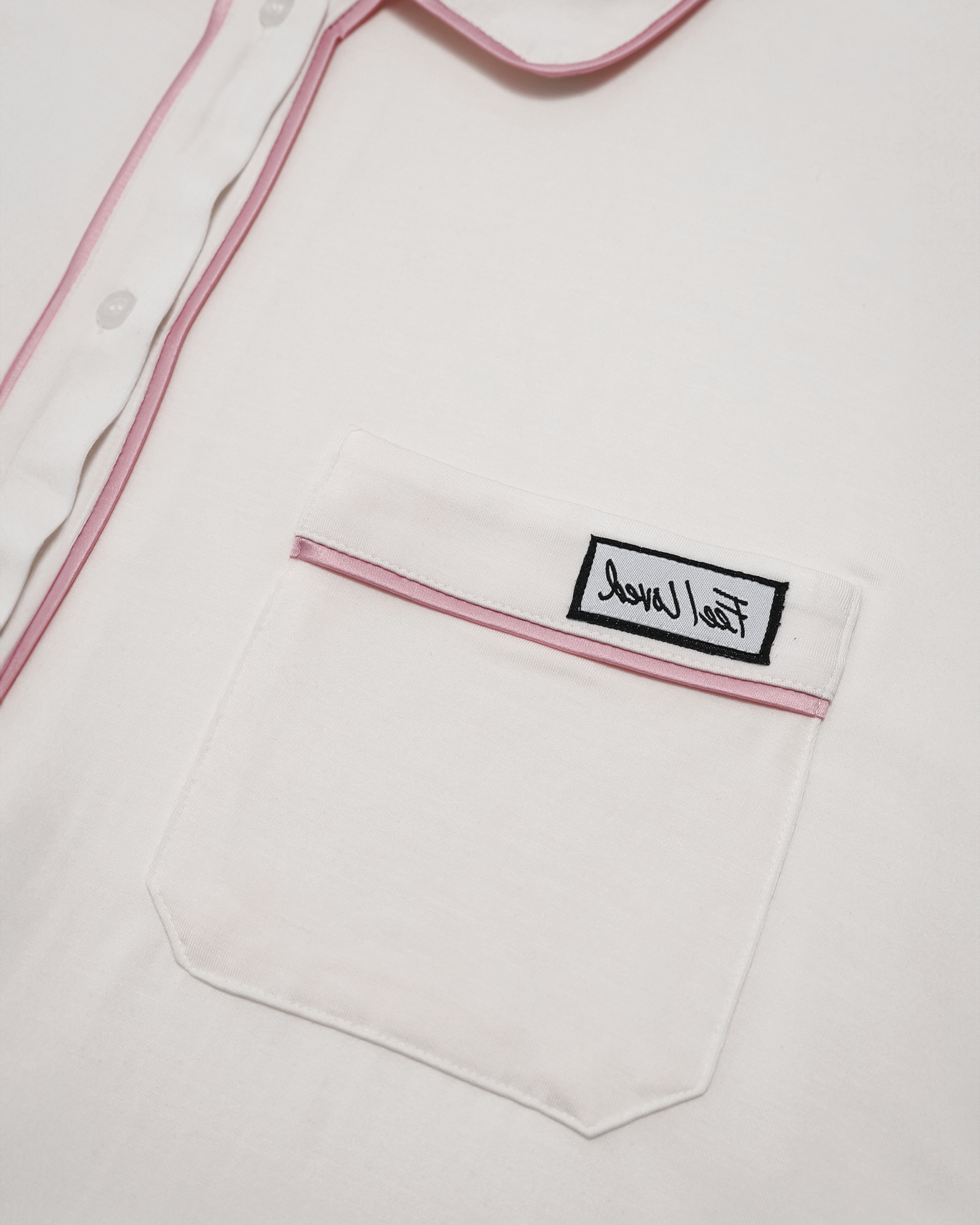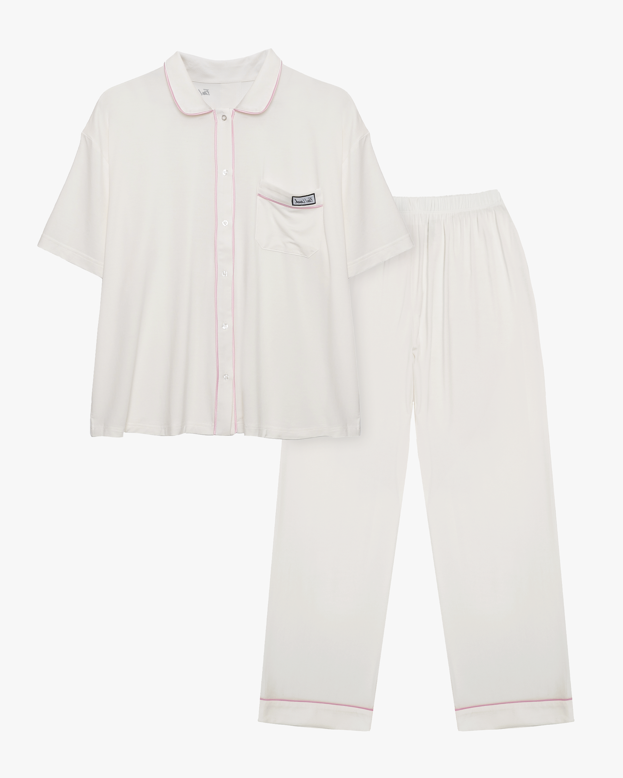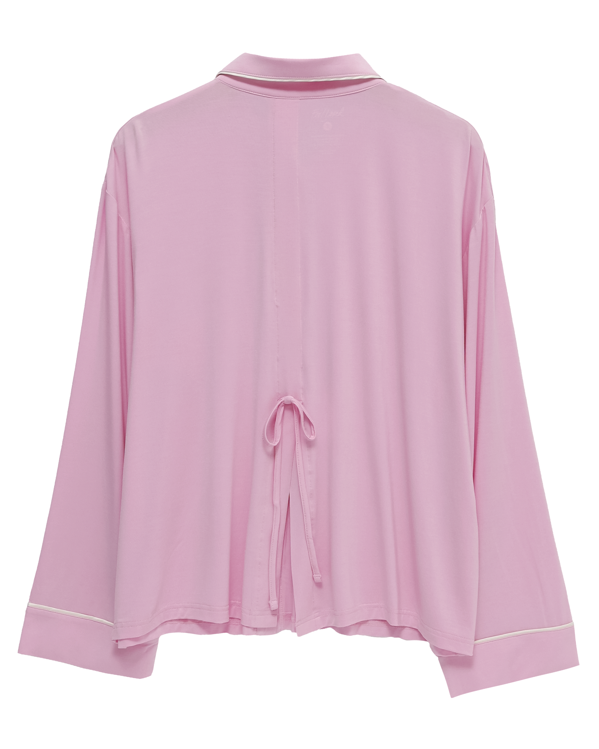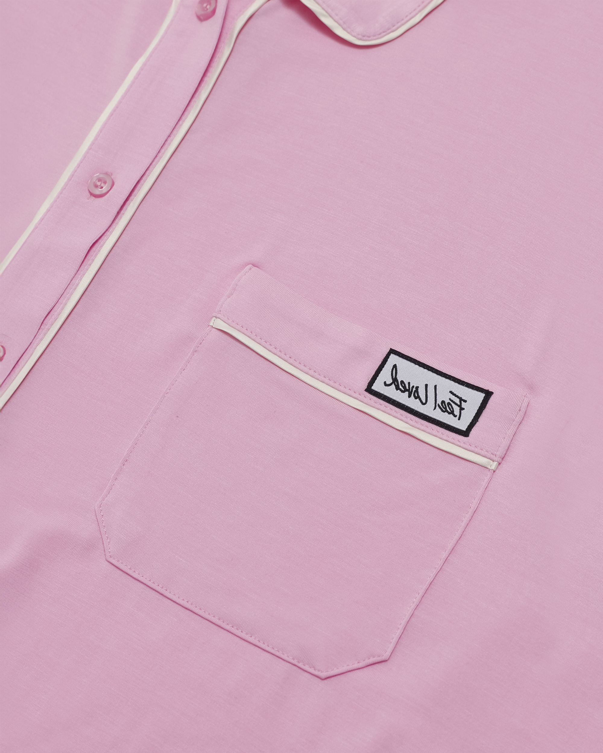 Experience ultimate summer comfort with this short sleeve button-up collared pajama top featuring luxurious satin trim. The design includes a stylish vent/slit on the back adorned with a tied bow and a single button on the sleeves for cuff rolling, complemented by a front left pocket for convenience.