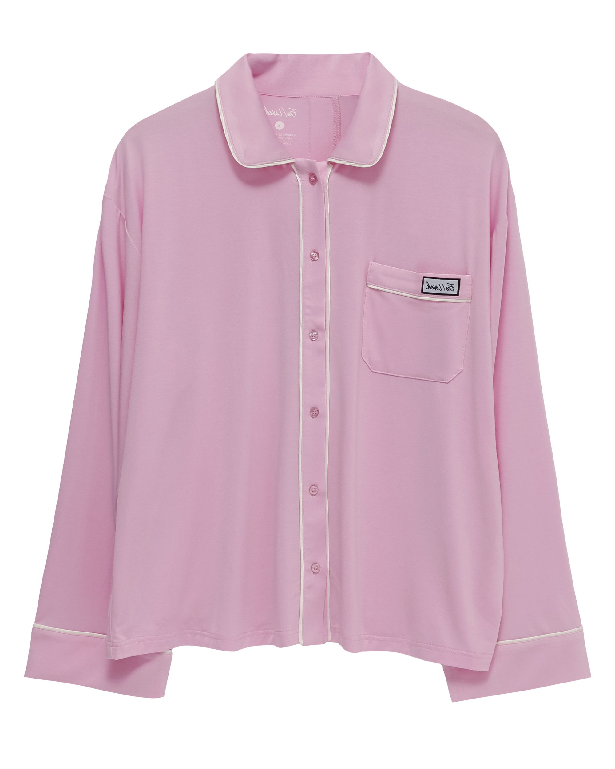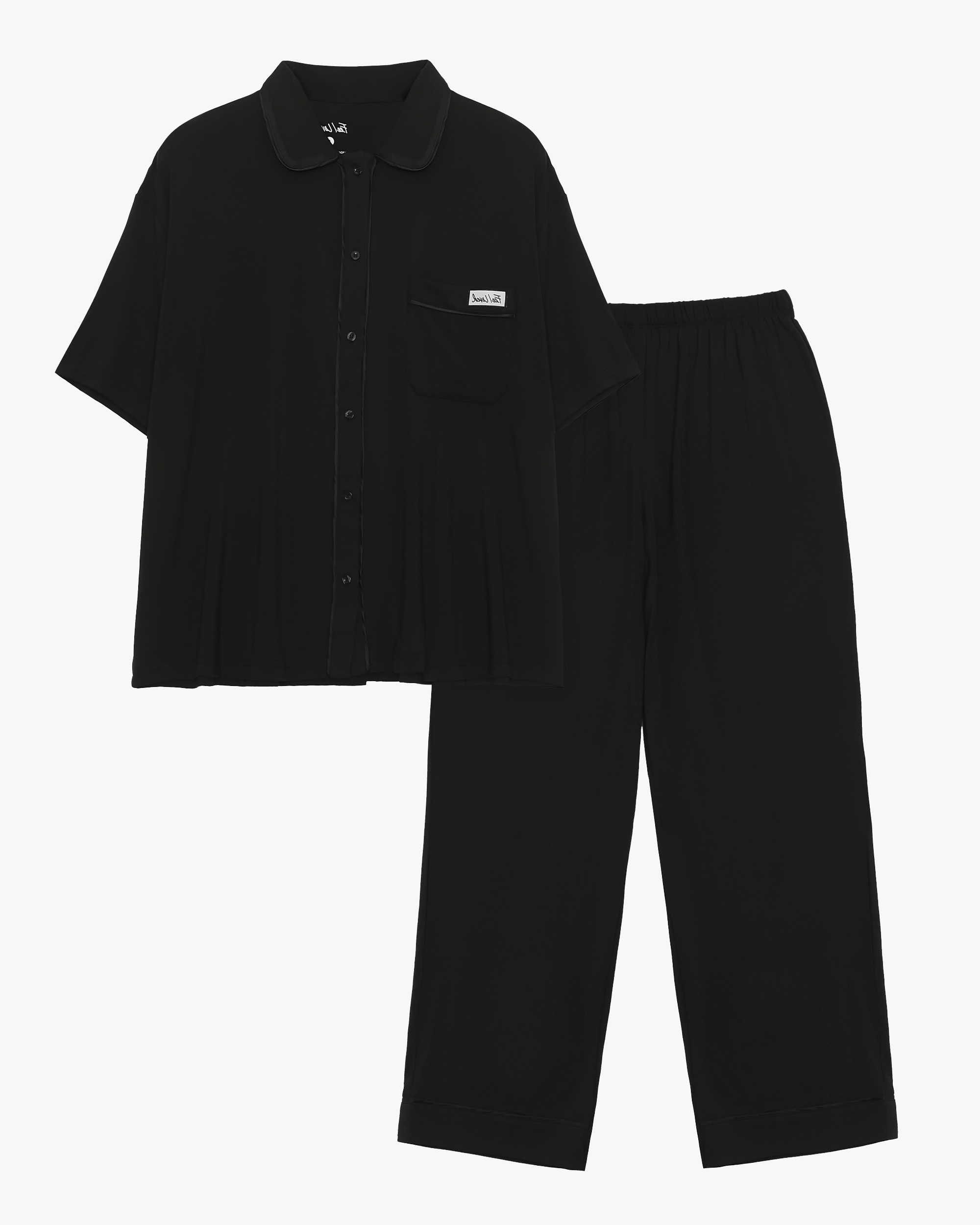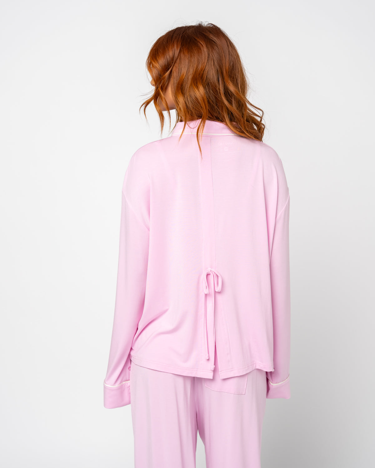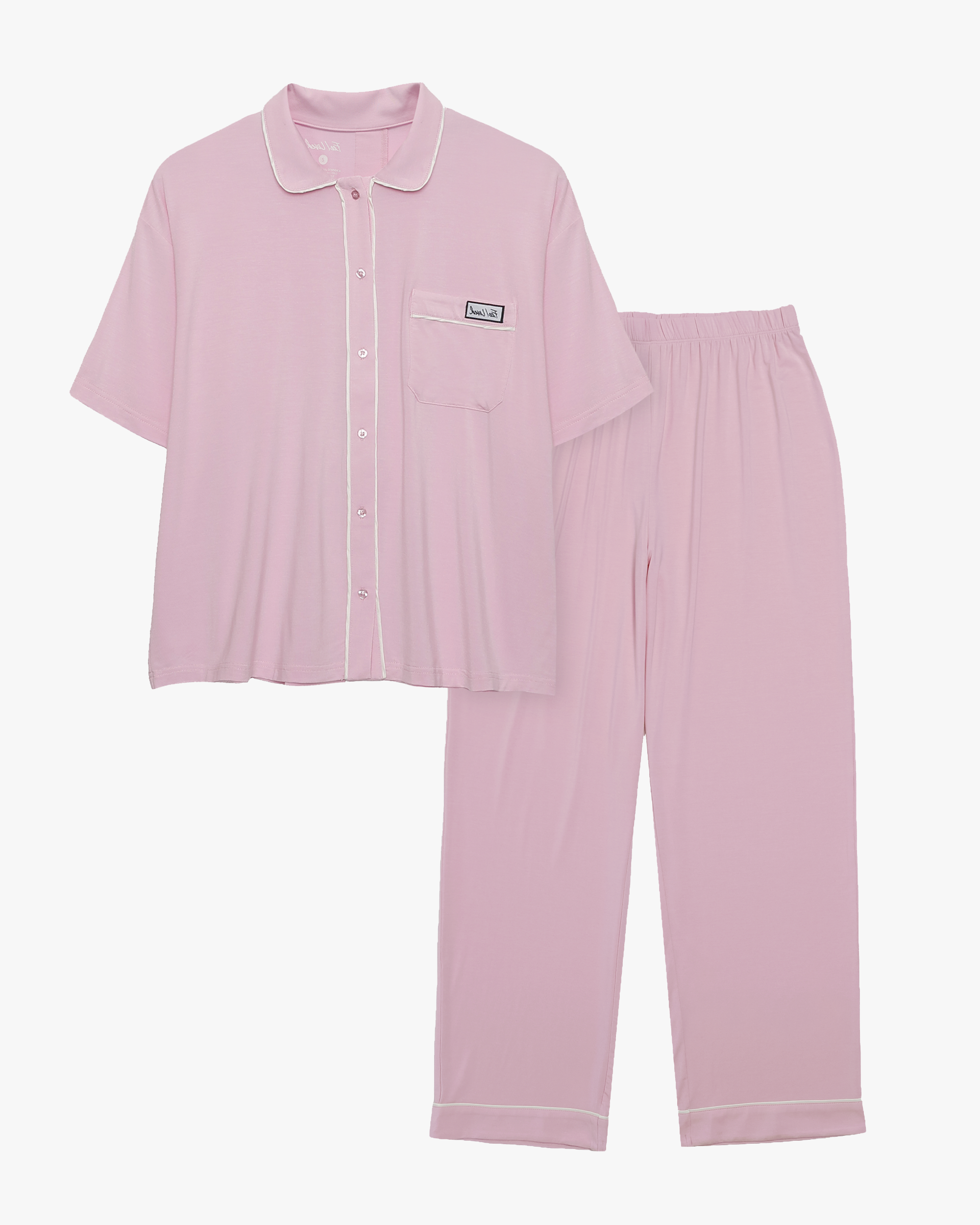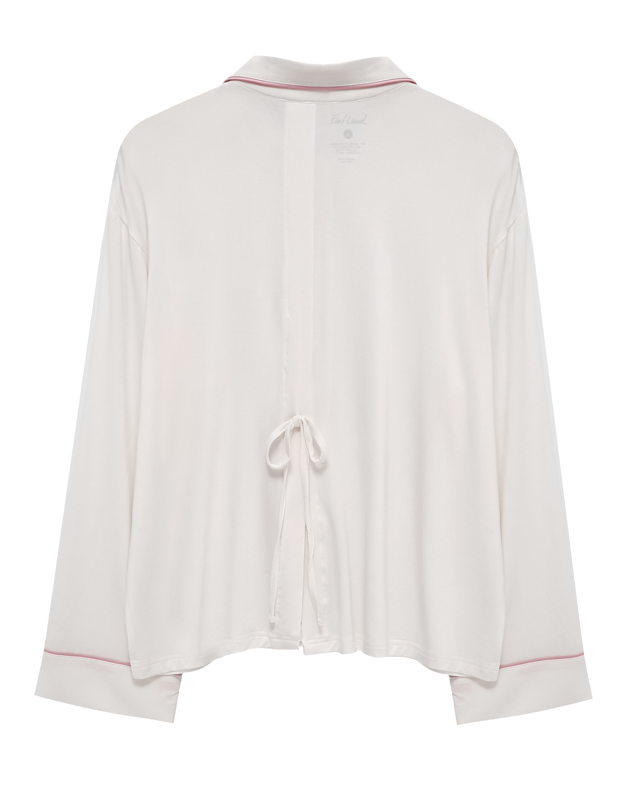Experience ultimate summer comfort with this short sleeve button-up collared pajama top featuring luxurious satin trim. The design includes a stylish vent/slit on the back adorned with a tied bow and a single button on the sleeves for cuff rolling, complemented by a front left pocket for convenience.