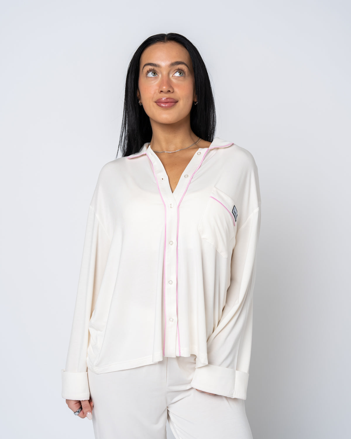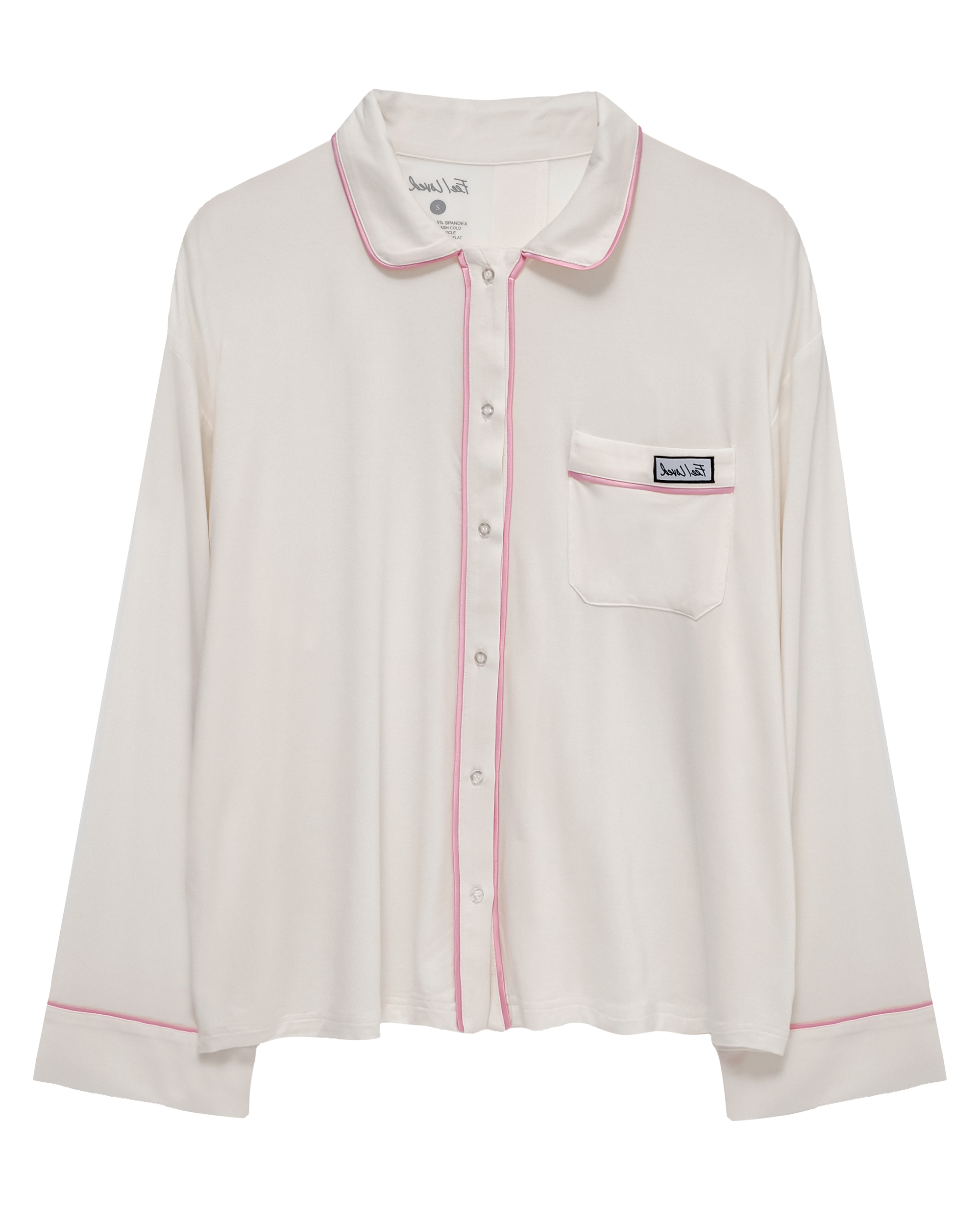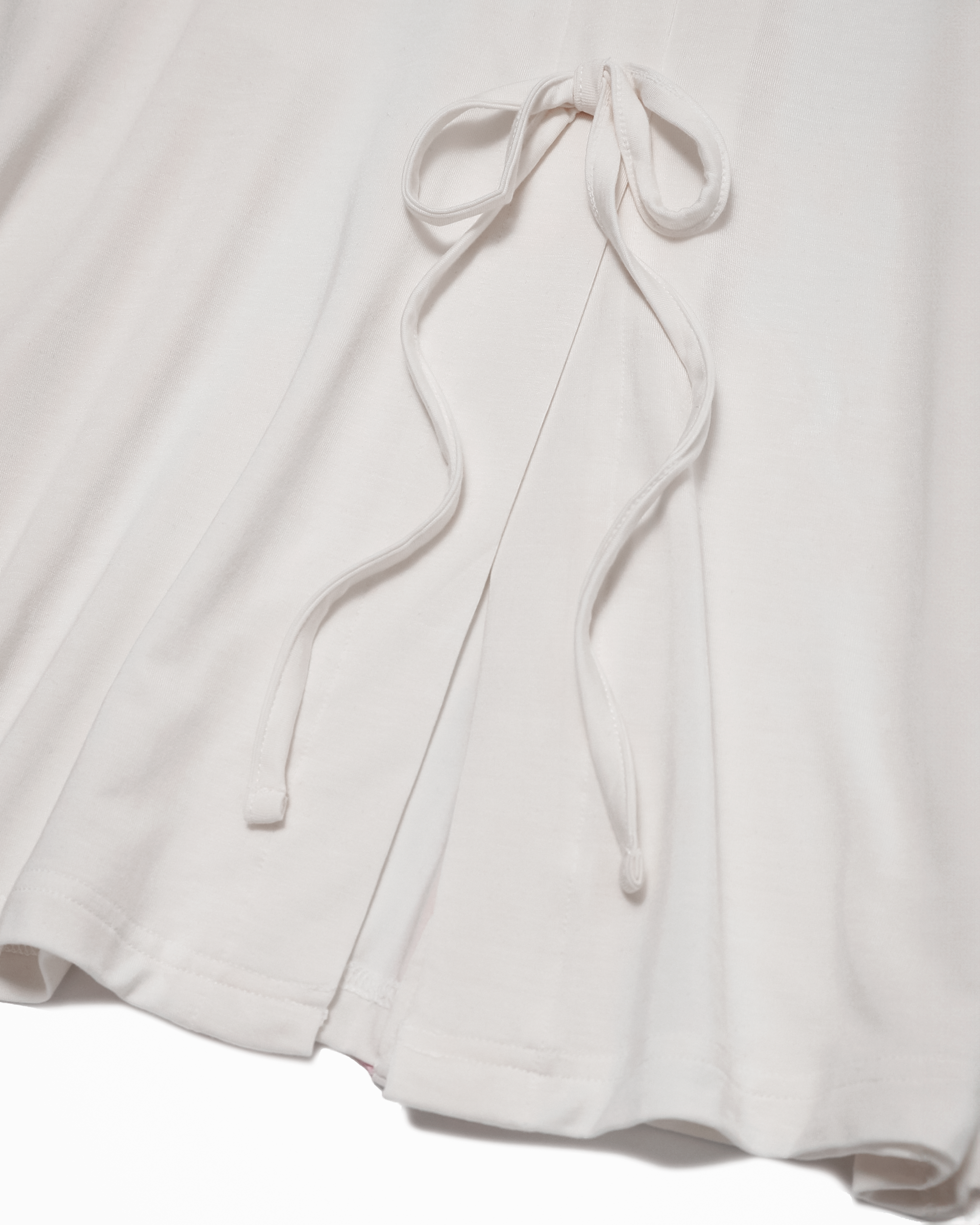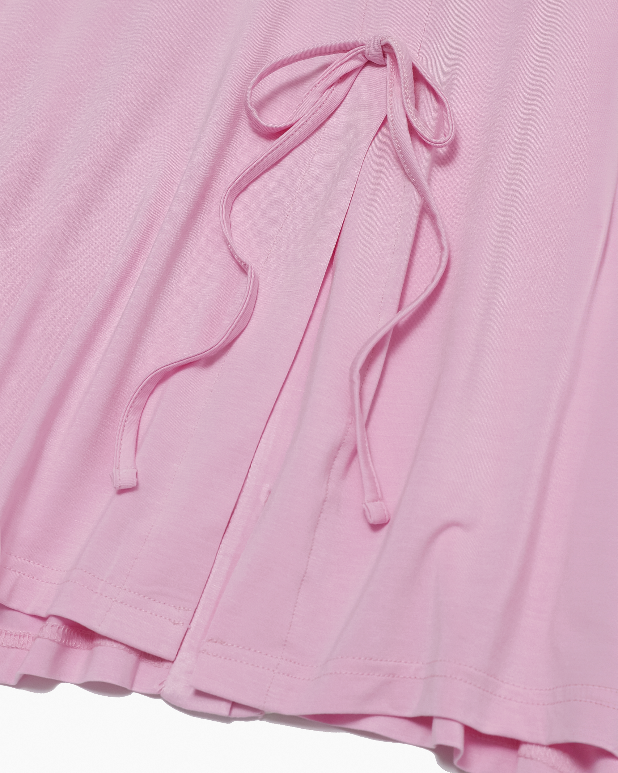 Experience ultimate summer comfort with this short sleeve button-up collared pajama top featuring luxurious satin trim. The design includes a stylish vent/slit on the back adorned with a tied bow and a single button on the sleeves for cuff rolling, complemented by a front left pocket for convenience.