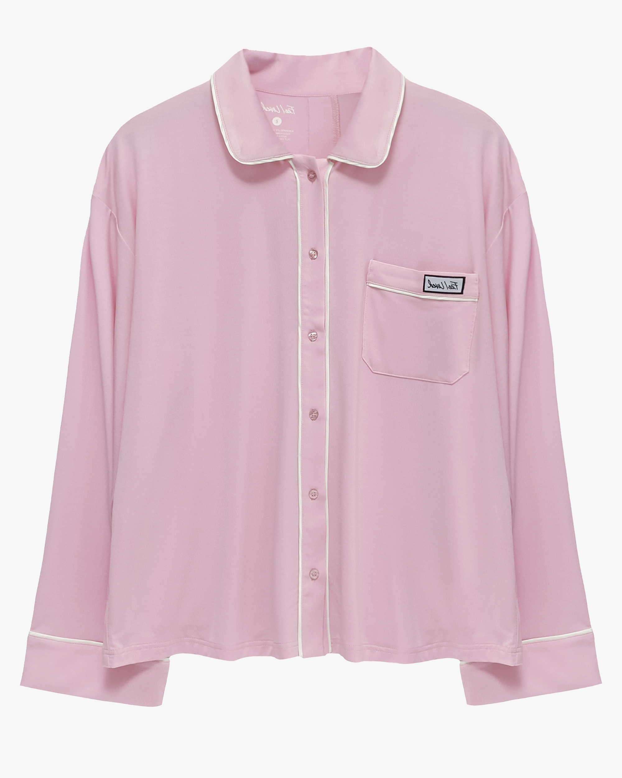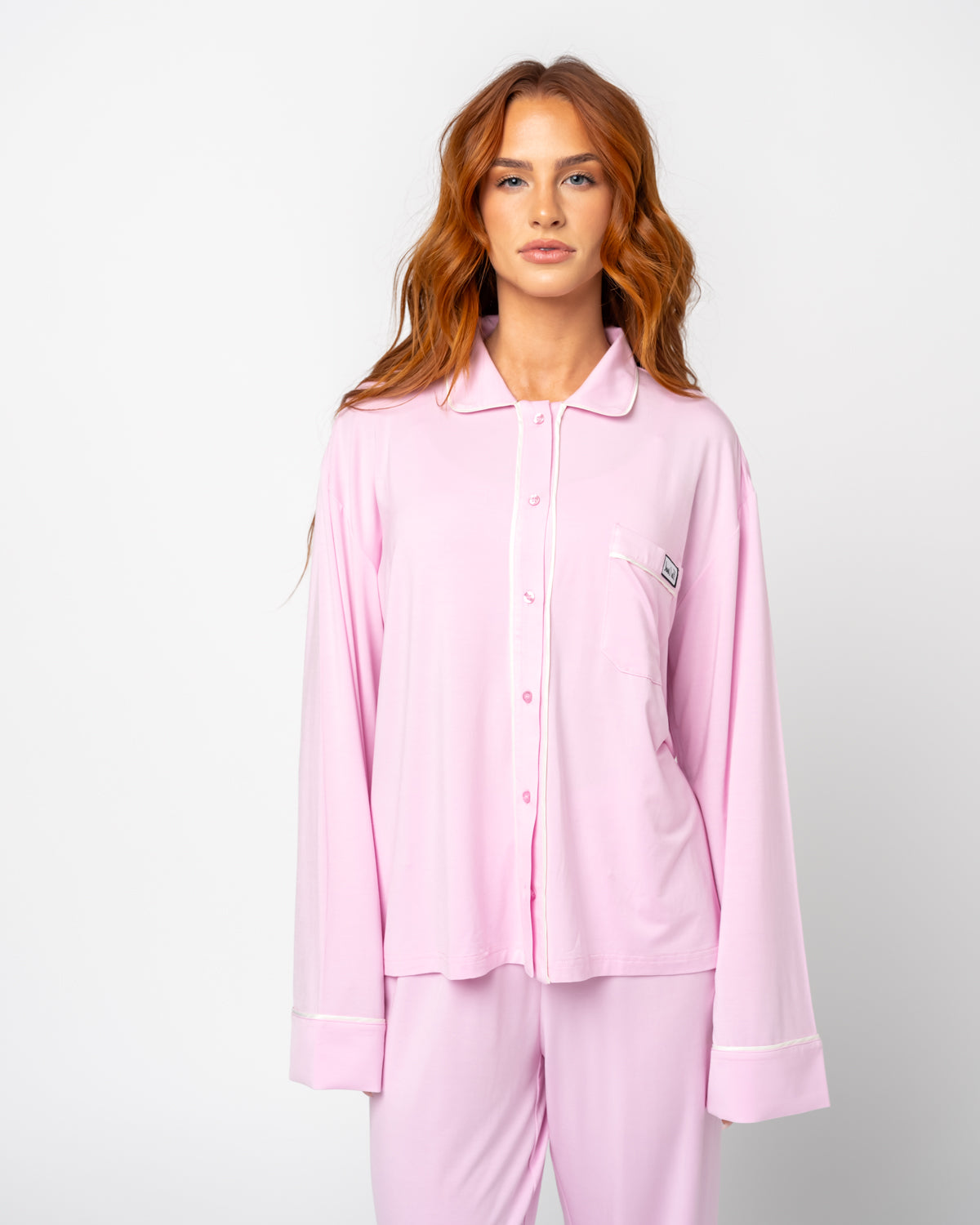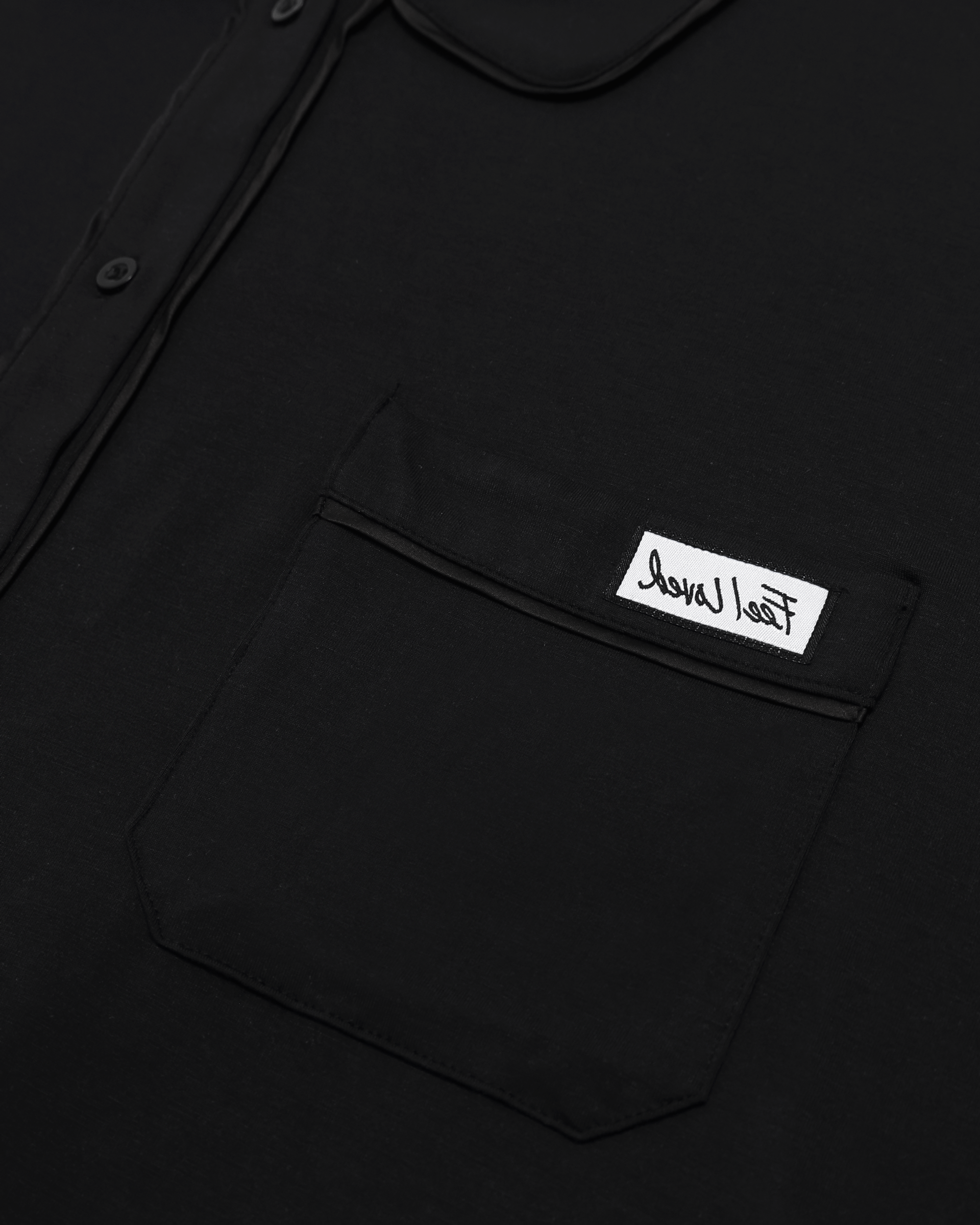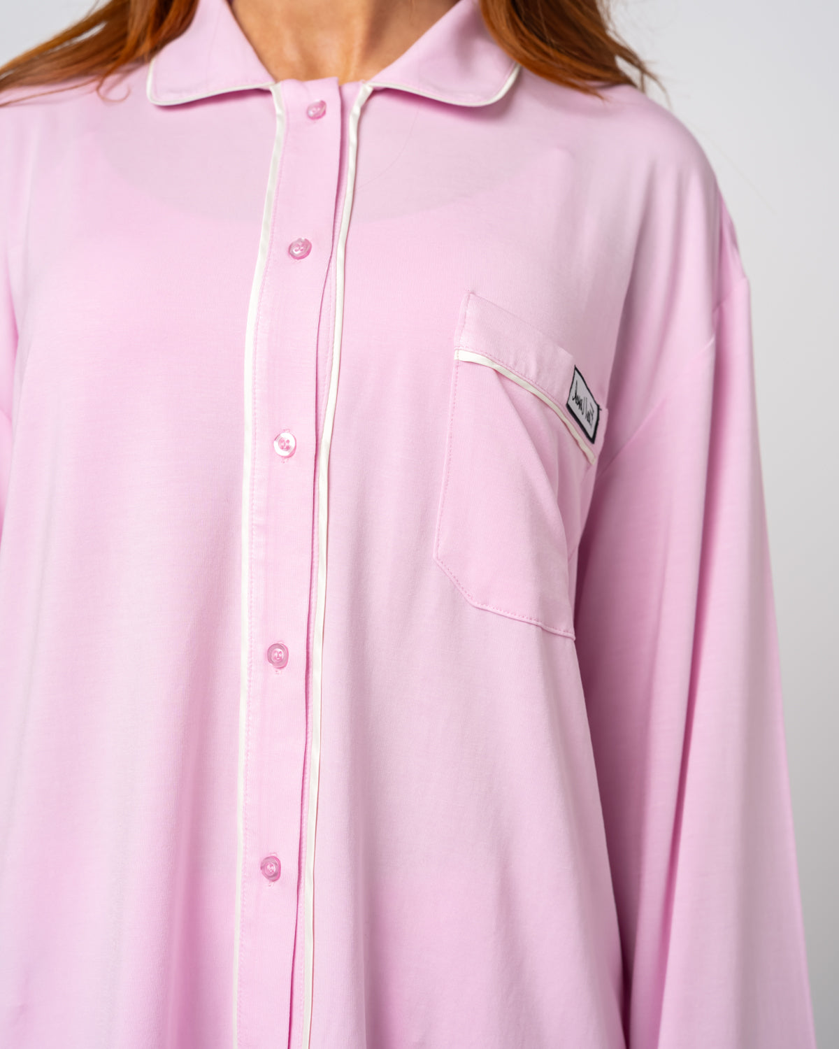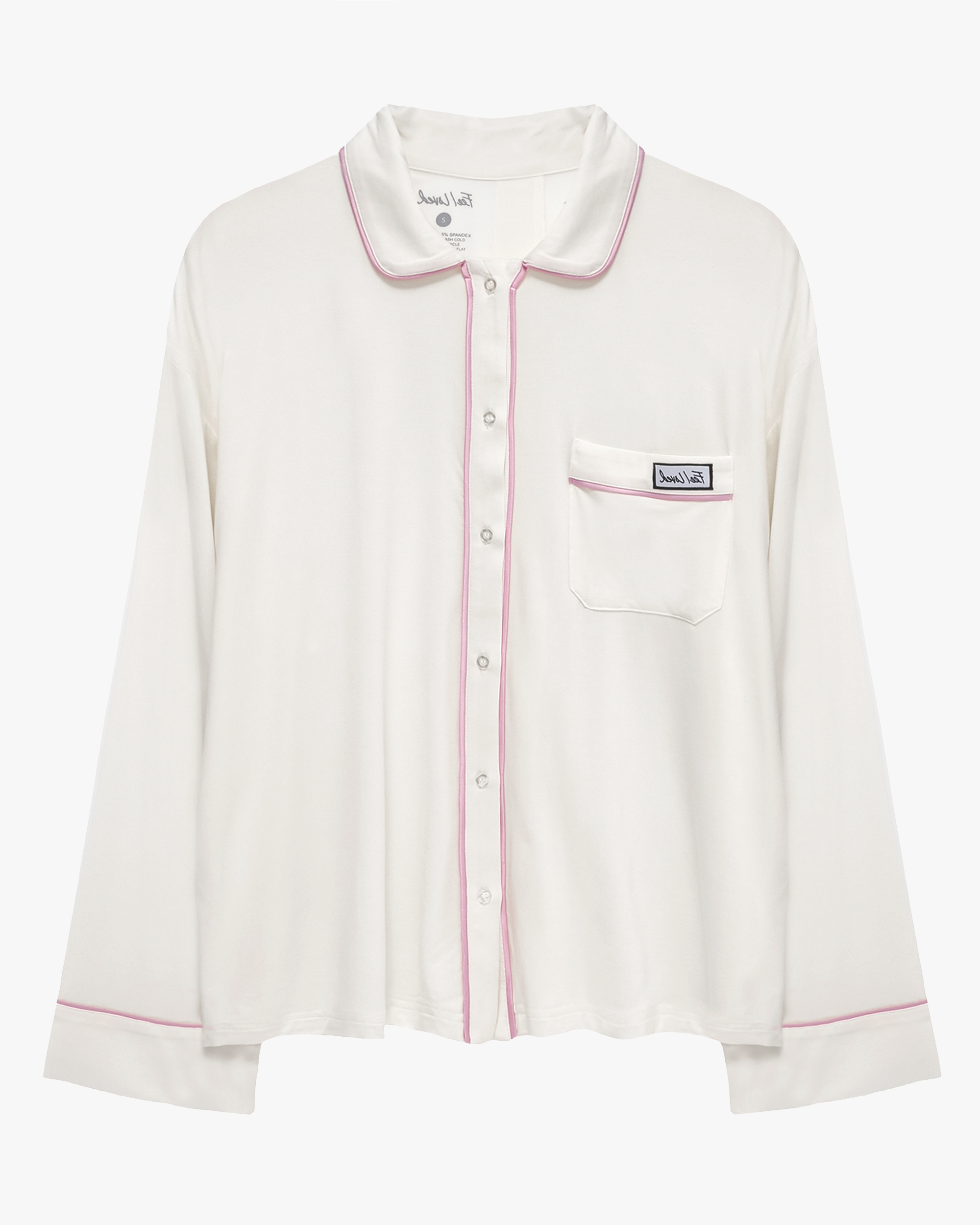 Experience ultimate summer comfort with this short sleeve button-up collared pajama top featuring luxurious satin trim. The design includes a stylish vent/slit on the back adorned with a tied bow and a single button on the sleeves for cuff rolling, complemented by a front left pocket for convenience.