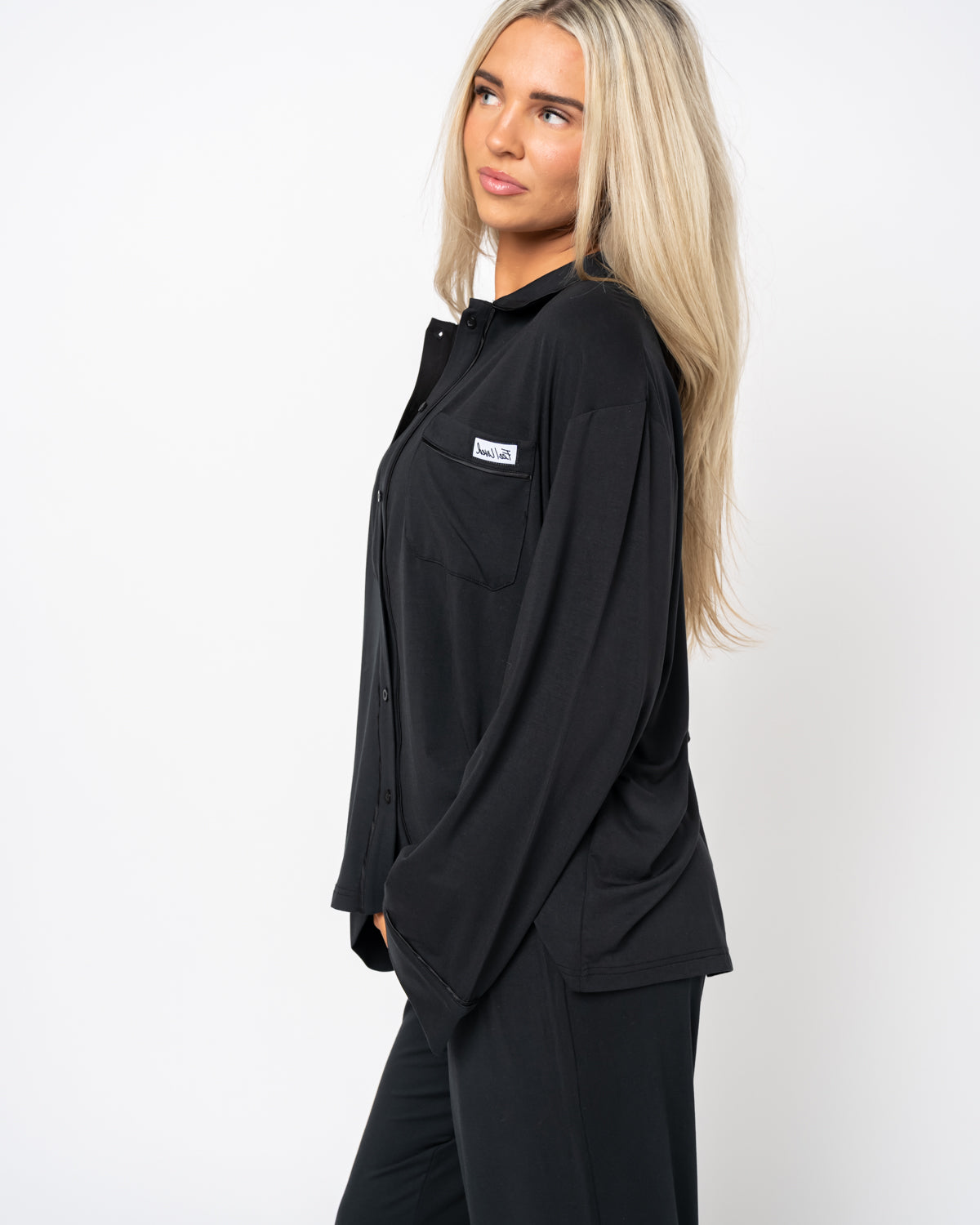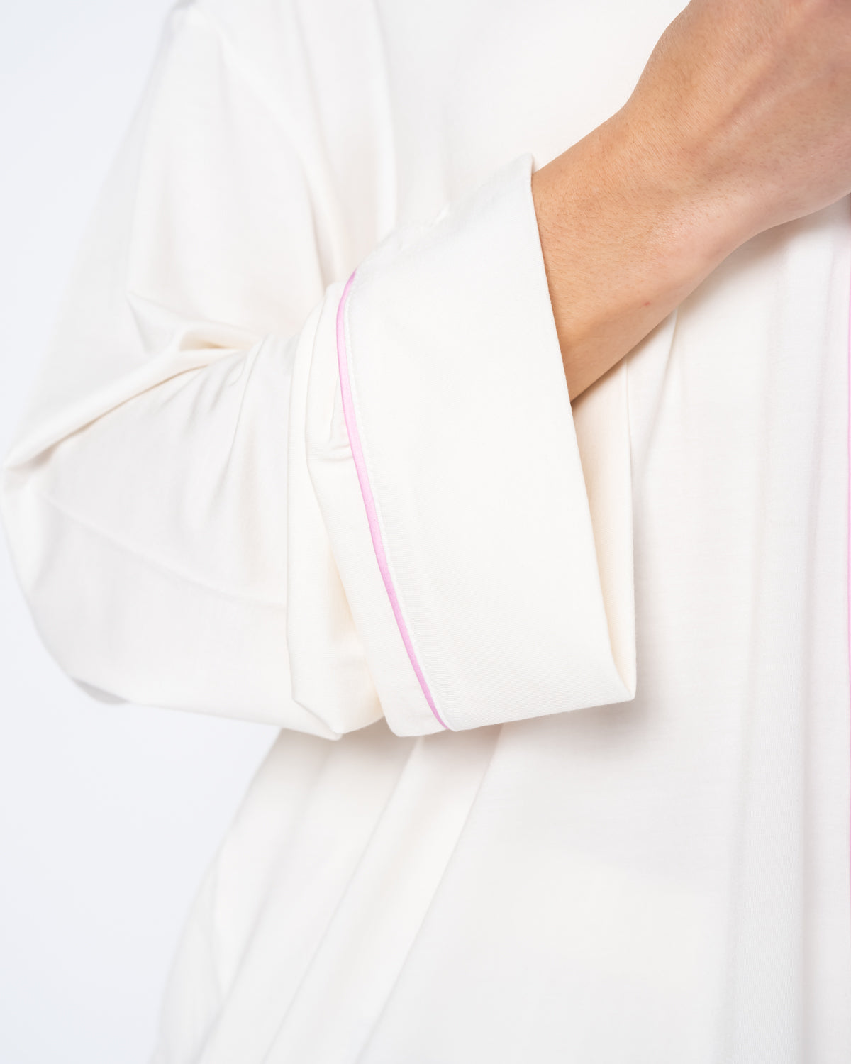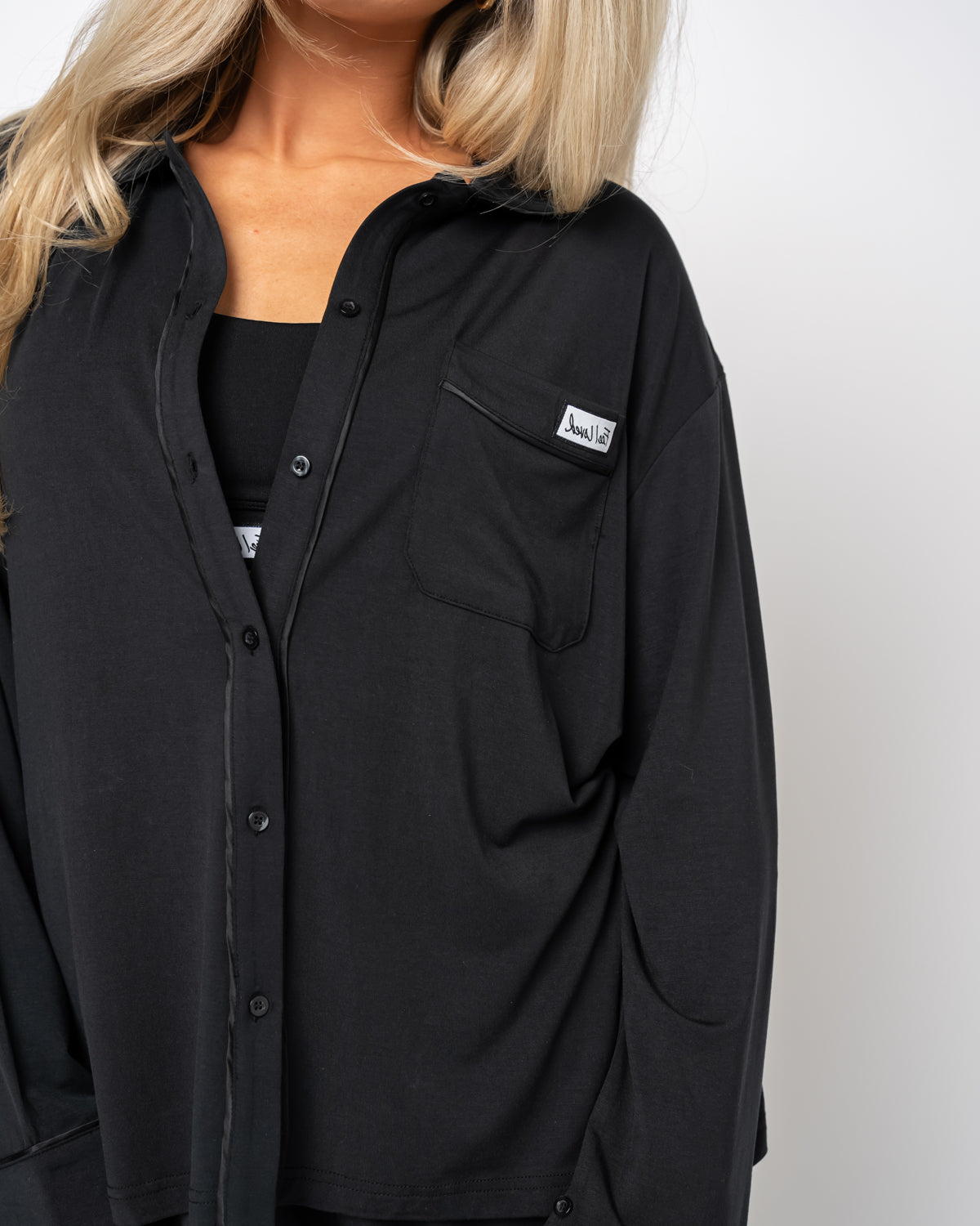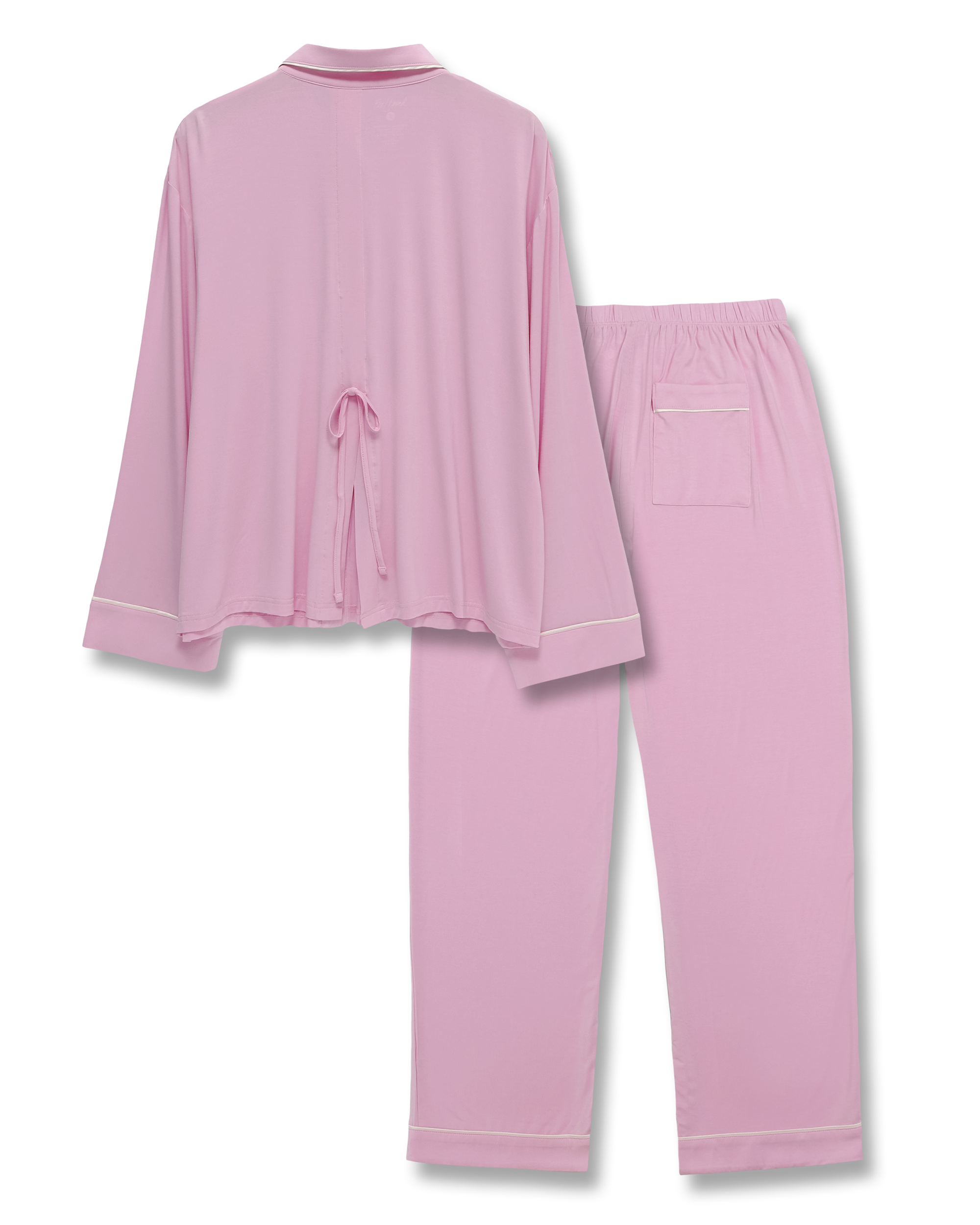 Experience ultimate summer comfort with this short sleeve button-up collared pajama top featuring luxurious satin trim. The design includes a stylish vent/slit on the back adorned with a tied bow and a single button on the sleeves for cuff rolling, complemented by a front left pocket for convenience.