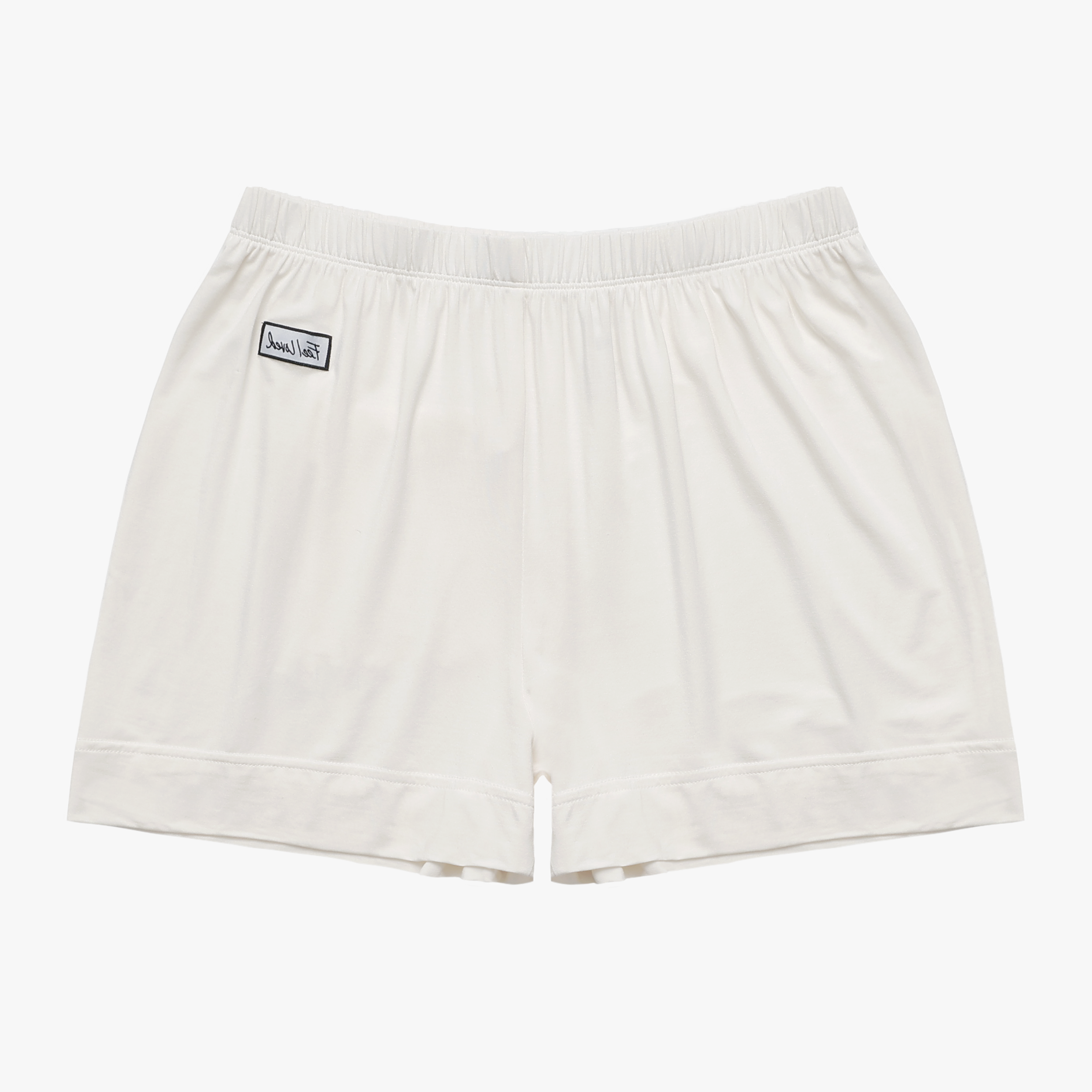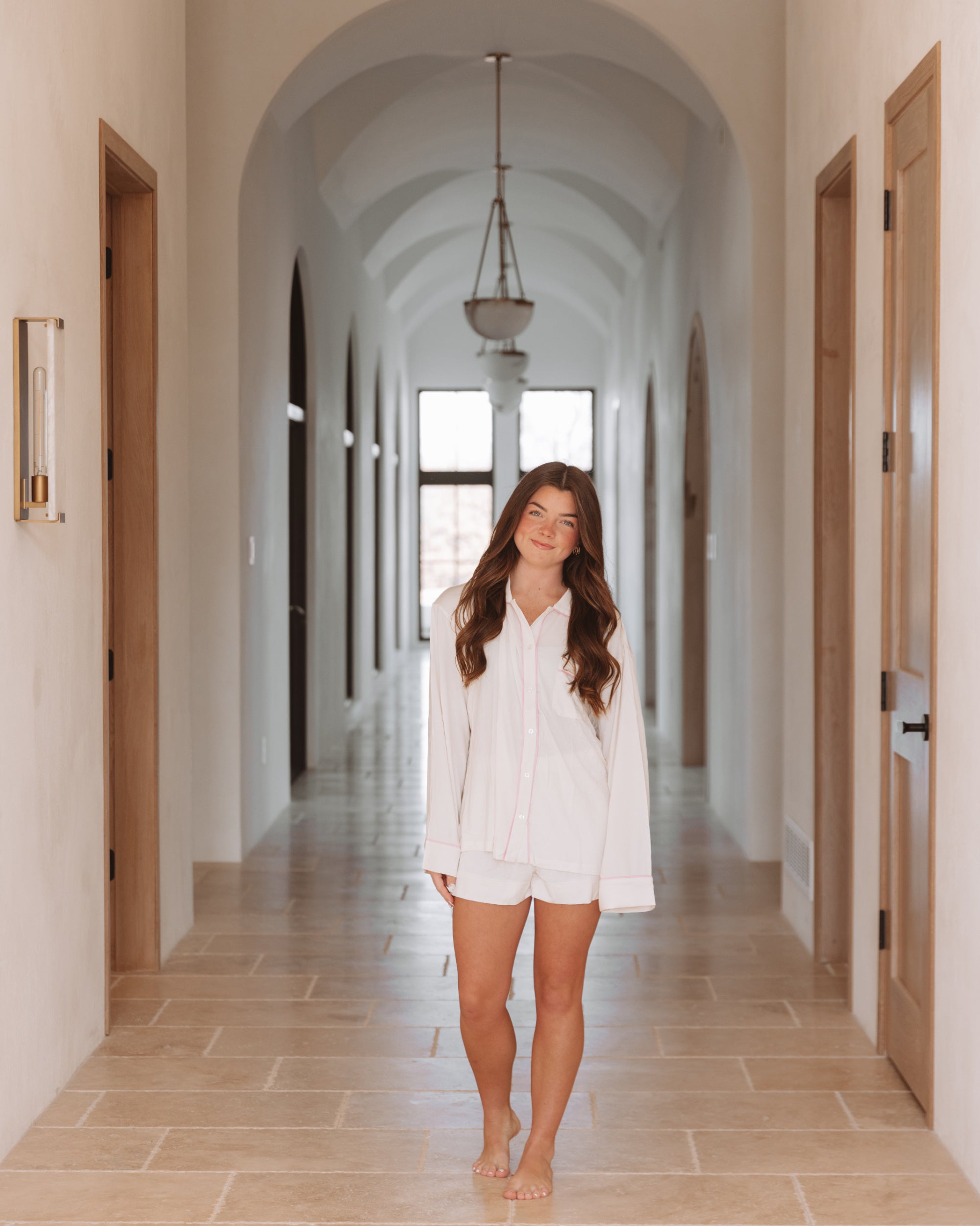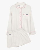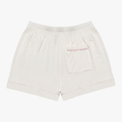 The matching pajama shorts boast the same elegant satin trim and an elastic waistband for a relaxed fit, along with a practical single pocket on the back right.