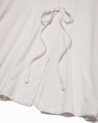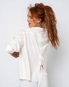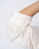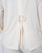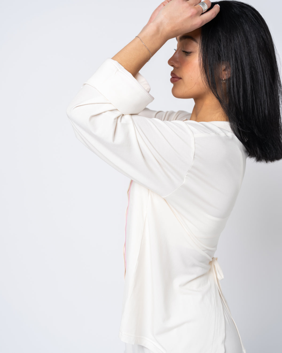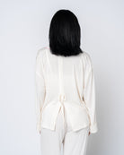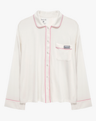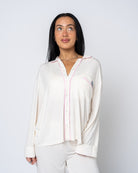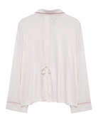 Experience ultimate comfort with this long sleeve button-up collared pajama top featuring luxurious satin trim. The design includes a stylish vent/slit on the back adorned with a tied bow and a single button on the sleeves for cuff rolling, complemented by a front left pocket for convenience.