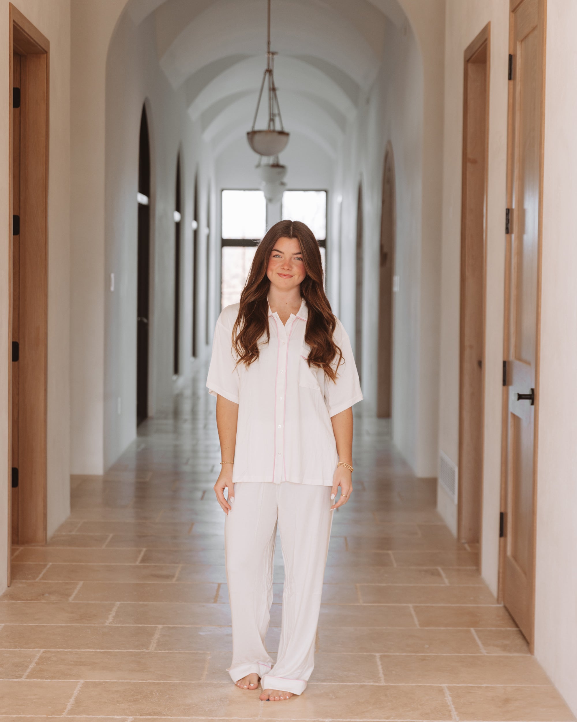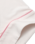 Experience ultimate comfort with this short sleeve button-up collared pajama top featuring luxurious satin trim. The design includes a stylish vent/slit on the back adorned with a tied bow and complemented by a front left pocket for convenience.