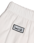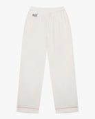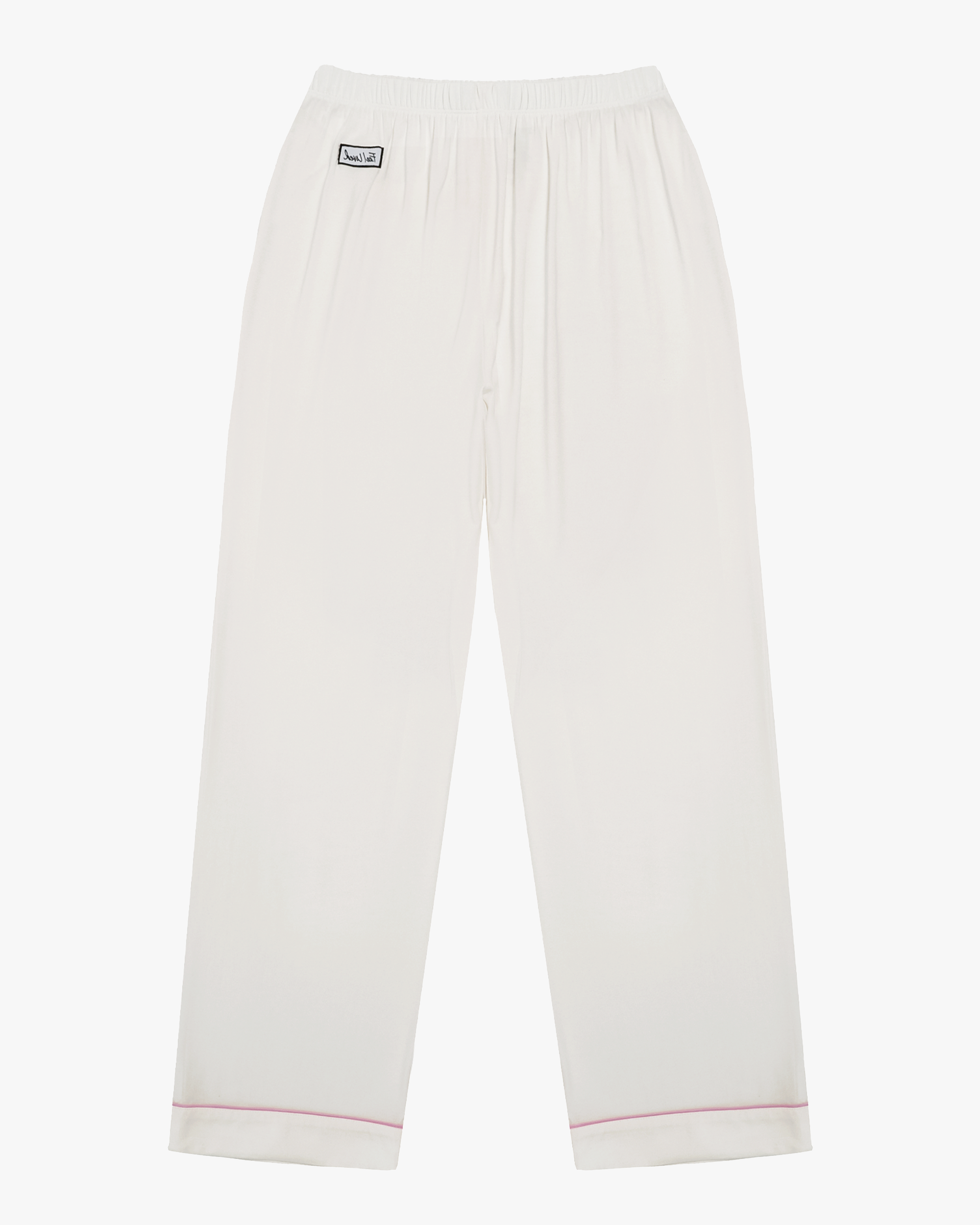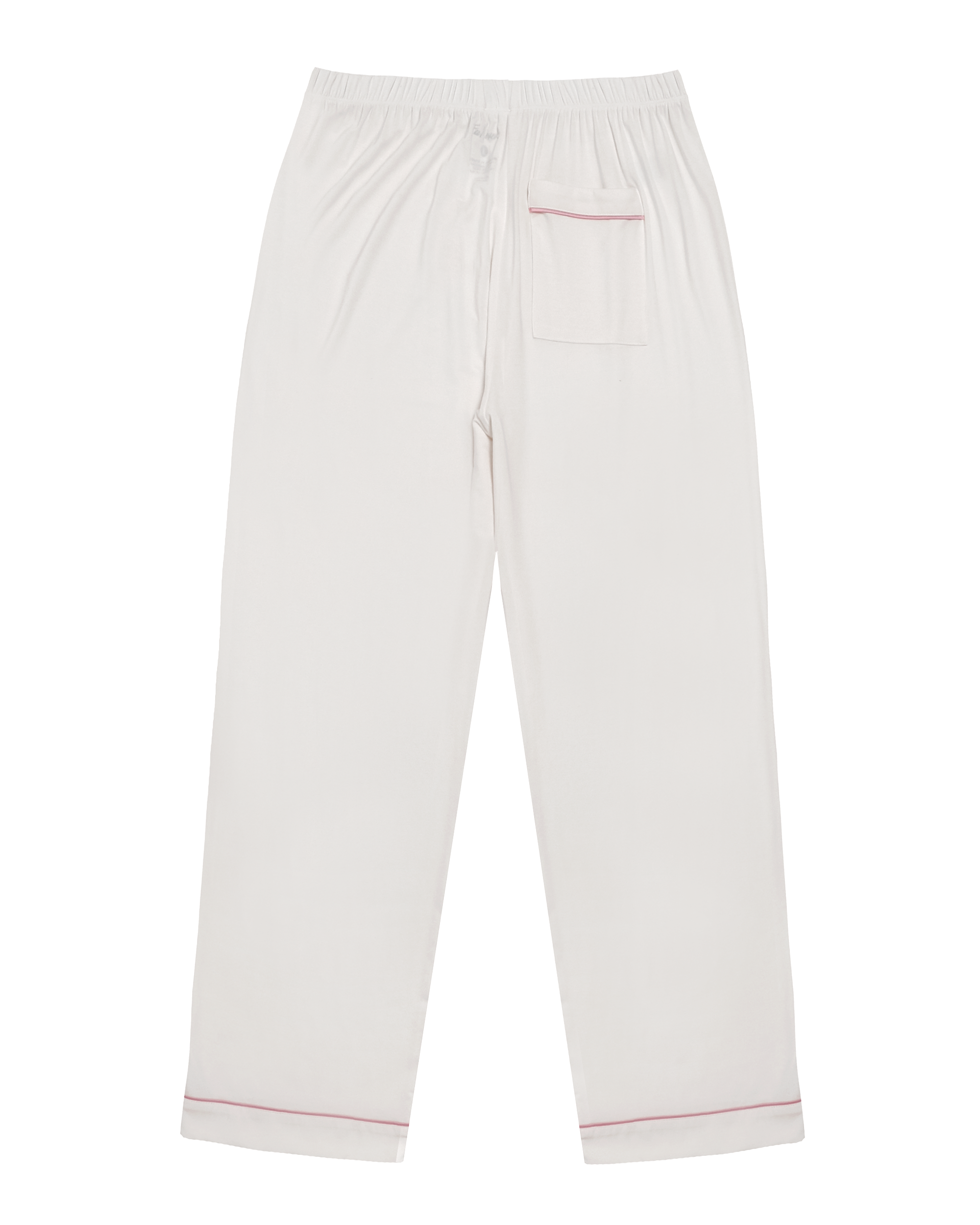 The matching pajama pants boast the same elegant satin trim and an elastic waistband for a relaxed fit, along with a practical single pocket on the back right.